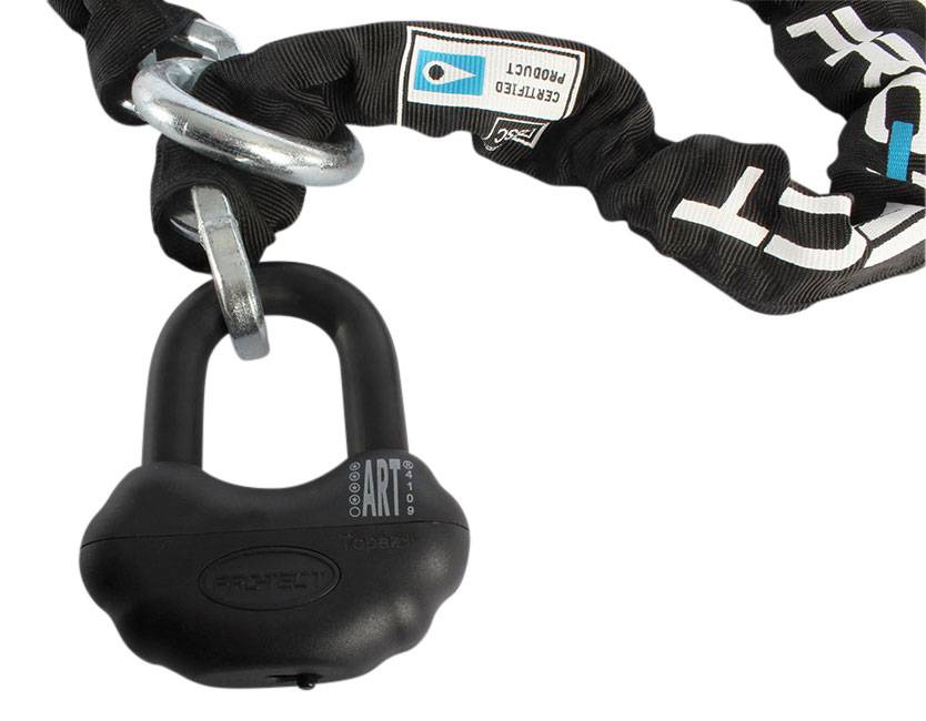 Het Pro-Tect TOPAZ+ ART 4 kettingslot is gemaakt van gehard staal. U maakt deze zware, solide TOPAZ+ vast met een hangslot, dat ook meteen een schijfremslot is. Mede daarom is deze Pro-tect goed bruikbaar als scooter- of brommerslot. De lengte van 150 centimeter kunt u volledig benutten, aangezien u de ketting met de slimme 'loop' kunt straktrekken.