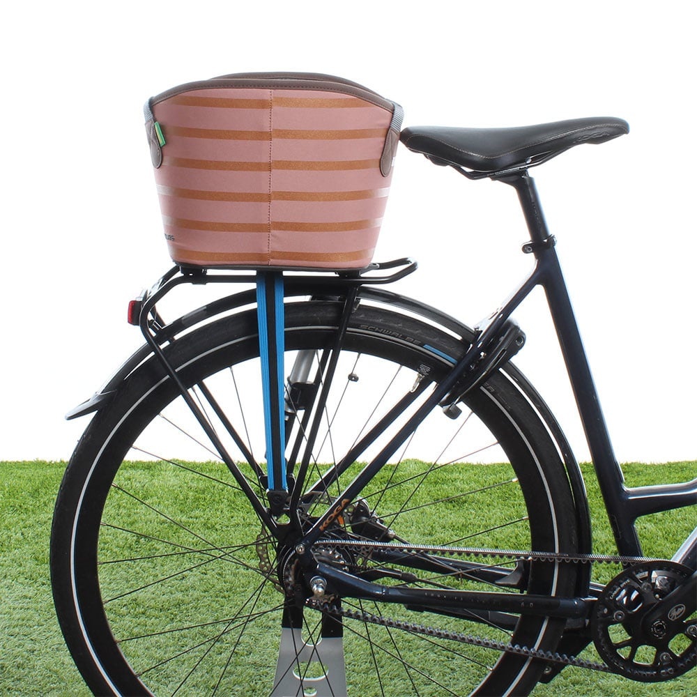 De fietsmand/fietstas Agnetha weegt bijna niets en u kunt er lekker veel in kwijt. Het is een praktische en leuke boodschappentas met een inhoud van 15 liter. De tas in de uitvoering 'Rosegold' is lichtroze met goudkleurige strepen. U bevestigt de tas gemakkelijk met de Snap-it 2.0-adapter op een Racktime 2.0-bagagedrager.