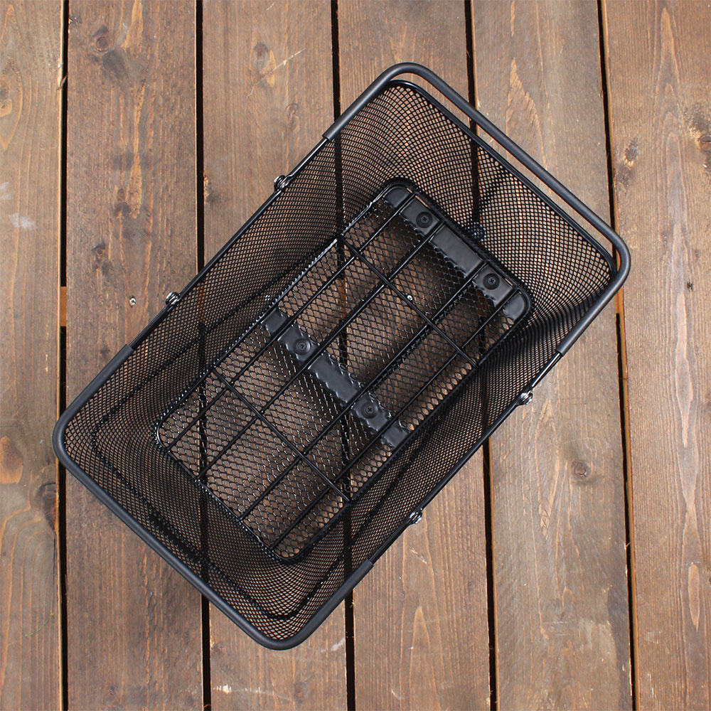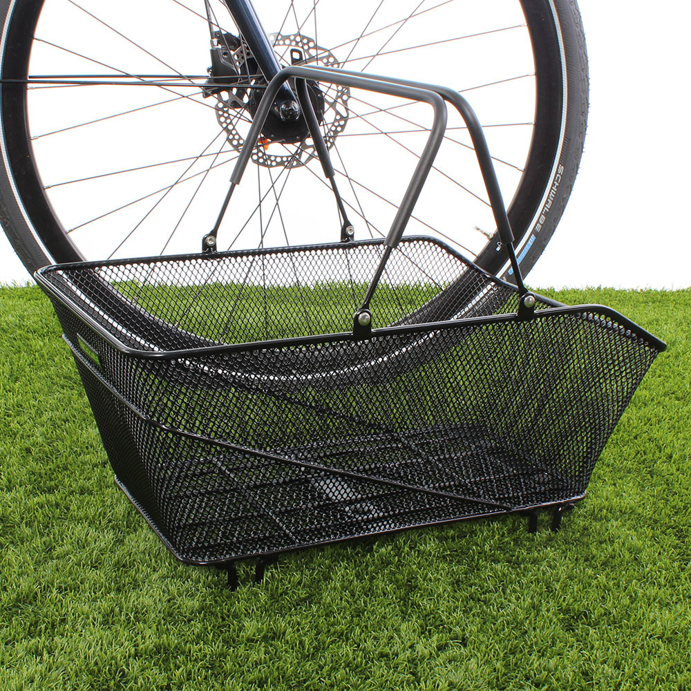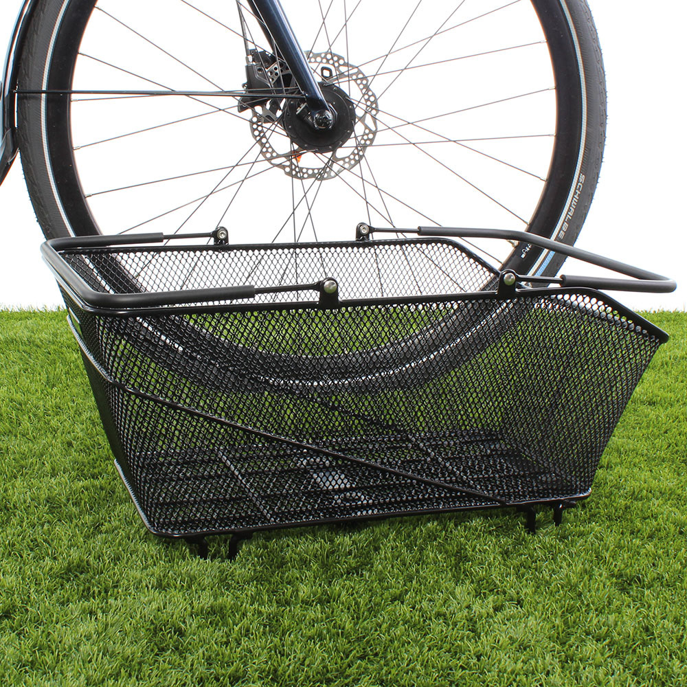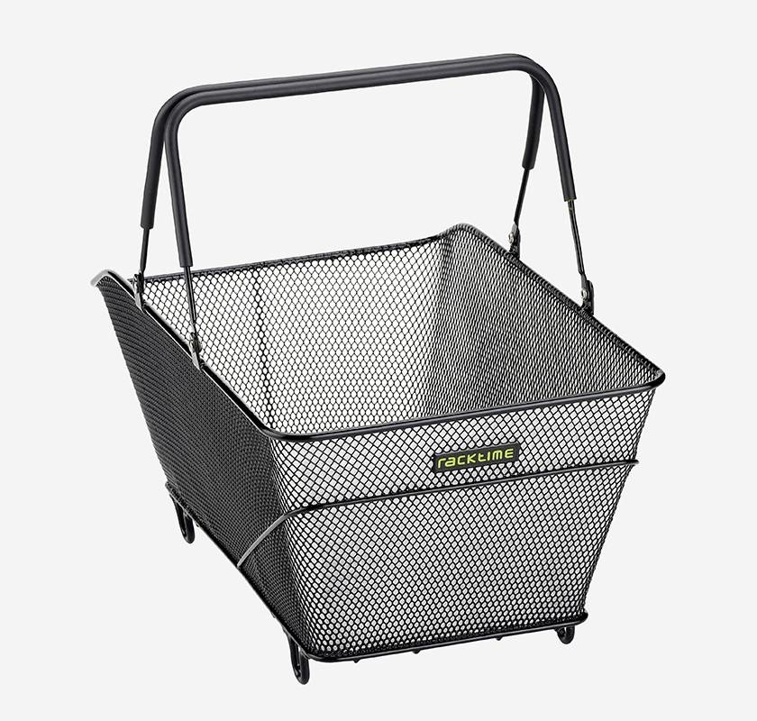Deze uitvoering van de stalen Racktime fietsmand Trunk voor achterop de fiets is in het zwart. Er zitten twee ruime, stabiele hengsels aan, met brede, van rubber voorziene grepen. De voorzijde is ietwat afgeschuind, voor extra ruimte aan de zadelkant.