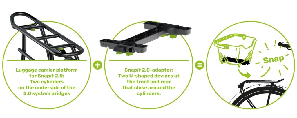 Let op: fietstassen, fietsmanden en andere accessoires die zijn voorzien van deze nieuwe Snap-it 2.0-adapter passen alleen op Racktime 2.0 bagagedragers. Heeft u geen 2.0 bagagedrager? Dan biedt de Snap-it 2.0 Connect bagagedrager-adapterplaat uitkomst. U kunt deze Connect adapterplaat los bijbestellen.