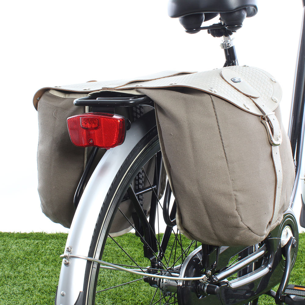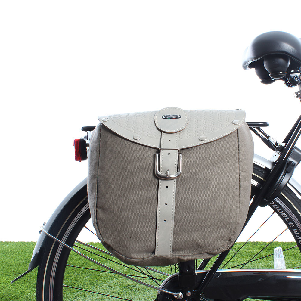 De British Bisaccia van Selle Monte Grappa is een luxueuze dubbele fietstas. De bovenkant van tas is gemaakt van skai-leer en de onderkant is van canvas. De tas is uitgevoerd in het grijs. De onderkant is iets lichter dan het bovenste gedeelte met de flap.