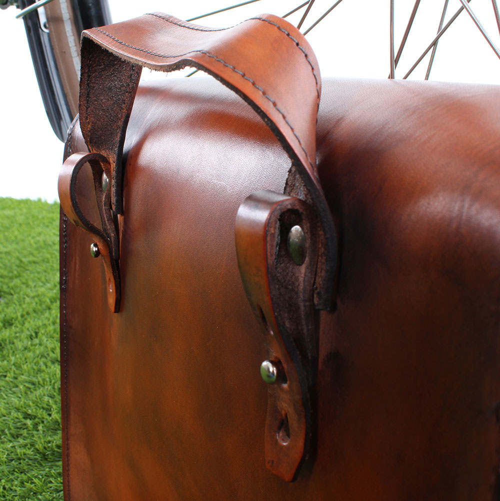 Deze bruin lederen tas heeft een ruim hoofdvak, welke u afsluit met een flap. Deze flap schuift u onder een riem door, zodat deze op zijn plek blijft zitten. U bevestigt deze tas eenvoudig aan uw bagagedrager met drie riempjes. Deze riempjes kunt u op drie verschillende punten vastzetten. Wanneer u de tas van de fiets afneemt kunt u deze als handtas dragen aan het soepele handvat. De tas wordt geleverd met een afneembare schouderriem, zodat u de tas ook als schoudertas kunt dragen.