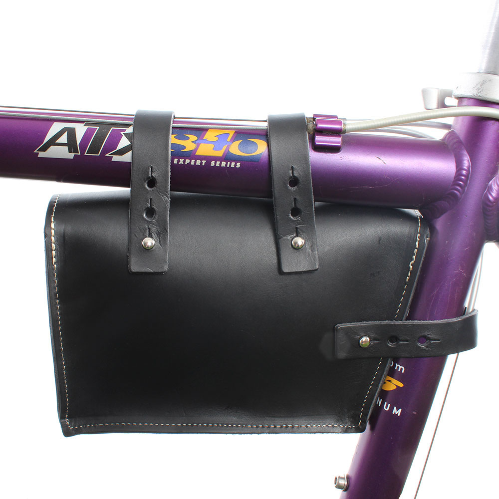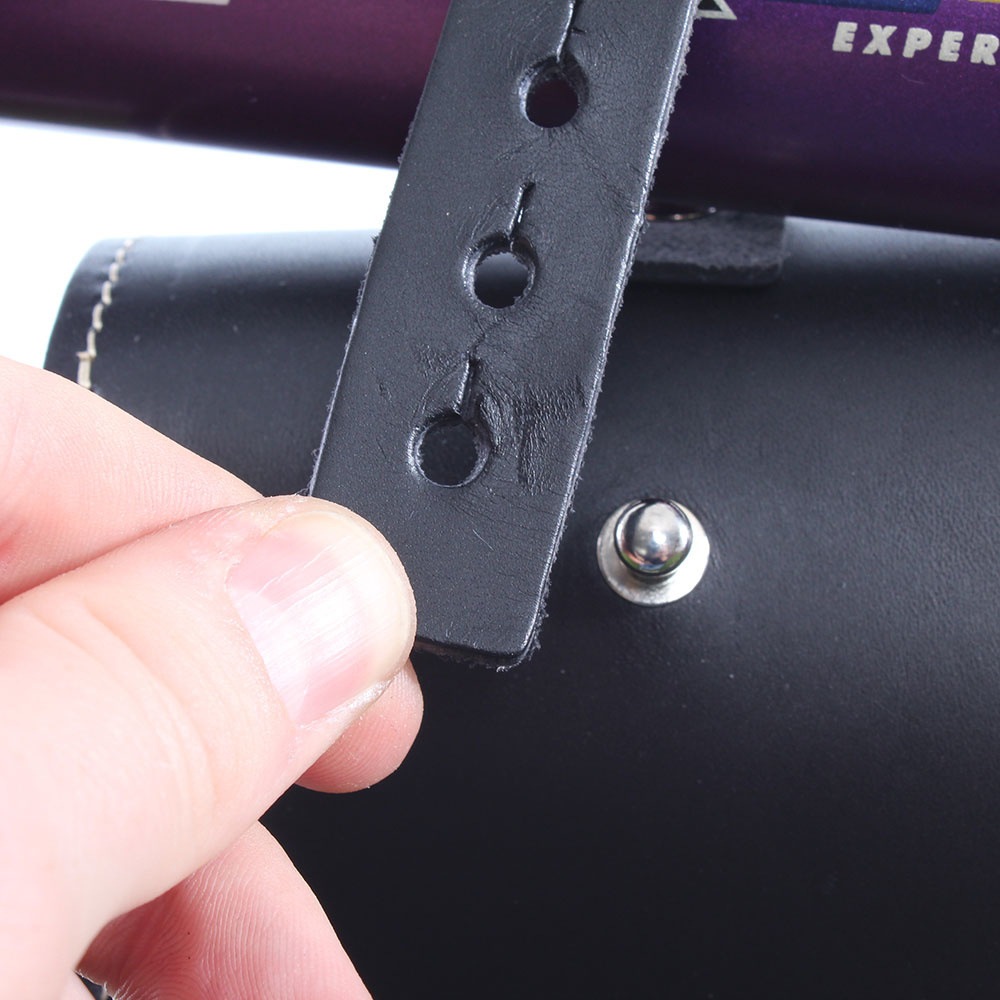 Deze zwarte lederen tas bevestigt u eenvoudig aan uw fiets met drie riempjes. Deze riempjes kunt u op drie verschillende punten vastzetten.
