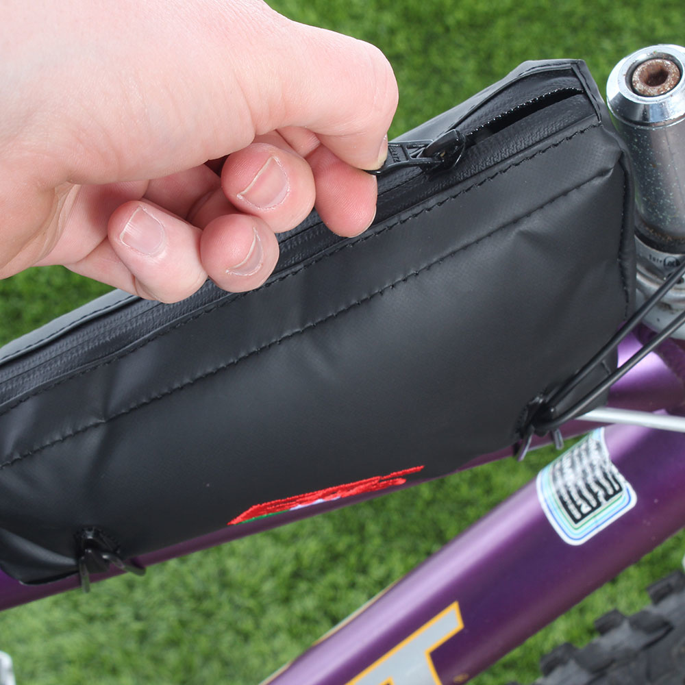 U bevestigt deze tas met twee zwarte ringen aan de bovenkant van de bovenste framebuis. De frametas staat dus bovenop de buis. Daarnaast zet u de tas met een extra ring vast aan de stuurpen die boven de balhoofdbuis uitkomt.