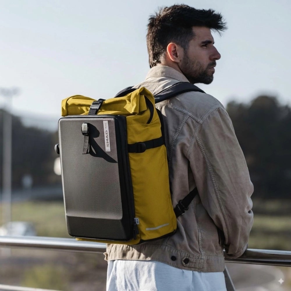 De Daily Pannier Backpack van het merk Shad is een fietstas en rugtas ineen, met een inhoud van ruim 22 liter. De duurzame fietsrugzak is gemaakt van gerecycled polyester afkomstig van plastic flessen. De mosterdgele fietstas is uitgerust met een laptopcompartiment, een rolsluiting en een regenhoes. Een ideale eigentijdse 'stadse' fietstas voor woon-werkverkeer op de fiets of voor dagelijks gebruik!