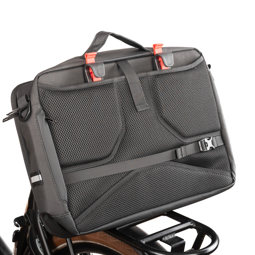 Met het KLICKfix Modul Rail-systeem is de fietstas gemakkelijk te bevestigen aan de drager van de fiets. De verschuifbare haken zijn geschikt voor dragers met een buisdikte tussen 8 en 16 millimeter. Wanneer u de rail niet gebruikt, kunt u deze gemakkelijk verwijderen. Onderaan de tas zit een band waarmee de fietstas extra stabiel aan de drager kan worden vastgemaakt. Op de bestemming aangekomen? Dan verbergt u de haken in het gewatteerde rugpaneel. De Office Bag kan gedragen worden aan het handvat bovenaan, of aan de comfortabele afneembare schouderband.