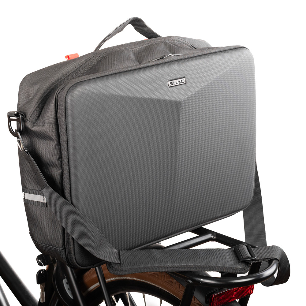 De Executive Office Bag van het merk Shad is een stevige kantoorfietstas, met een inhoud van ca. 16 liter. De fietstas is gemaakt van UV-bestendig polyester. De zwarte tas is uitgerust met een laptopcompartiment, een organiser, reflectie en een regenhoes. Een moderne fietstas met een zakelijke uitstraling, voor woon-werkverkeer op de fiets!