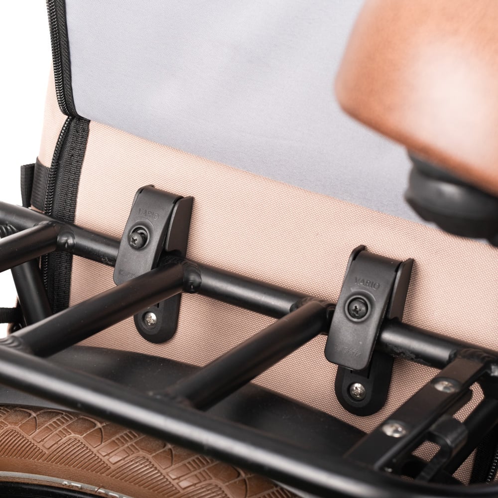 U bevestigt de fietstas gemakkelijk aan de bagagedrager van de fiets met stevige KLICKfix Vario-haken, geschikt voor buisdiameters van 6 tot 16 millimeter. Onderaan de rugtas zit een band waarmee de fietstas extra stabiel aan de drager kan worden vastgemaakt. Op de bestemming aangekomen? Dan verbergt u de haken in het gewatteerde rugpaneel met ritssluiting. Dankzij de twee hengsels is de tas gemakkelijk te dragen. Deze hengsels kunnen met een drukknoop aan elkaar vastgemaakt worden. En met de bijgeleverde afneembare zwarte schouderriem is de tas ook te gebruiken als schoudertas.