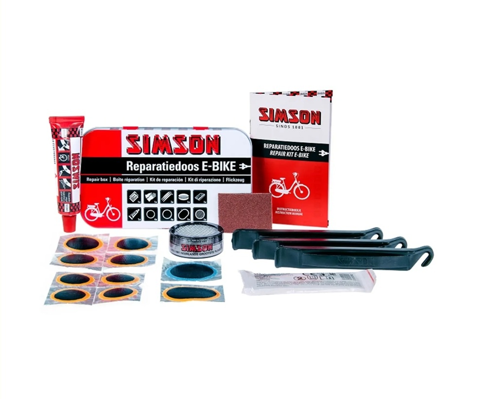 E-bikes worden vaak voor lange ritten gebruikt en tijdens het toeren is de bewoonde wereld niet altijd even dichtbij. Daarom heeft Simson een handige lekzoeker toegevoegd in de reparatiedoos. Met deze lekzoeker kan het lek zonder hulp van bijvoorbeeld een emmer water alsnog makkelijk gevonden worden. De kunststof bandenlichters voorkomen beschadigingen aan de aluminium velgen die veel e-bikes hebben. En om ervoor te zorgen dat u na het repareren van de band niet met vieze vingers het display van de e-bike gaat bedienen, is een setje handschoenen bijgevoegd.