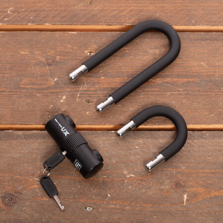 Het hier beschreven slot is een Eyelet M met een U/X-Lock. Dit houdt in dat het slot wordt geleverd met twee beugels van verschillende lengtes. De langere X-lock beugel (14 cm) bevestigt verschillende fietsonderdelen of je fiets aan vaste objecten. De kortere U-lock beugel (6 cm) zit juist dichter bij de fiets, waardoor deze moeilijker open te breken is. De sluitingen kunnen aan beide zijden worden vergrendeld.