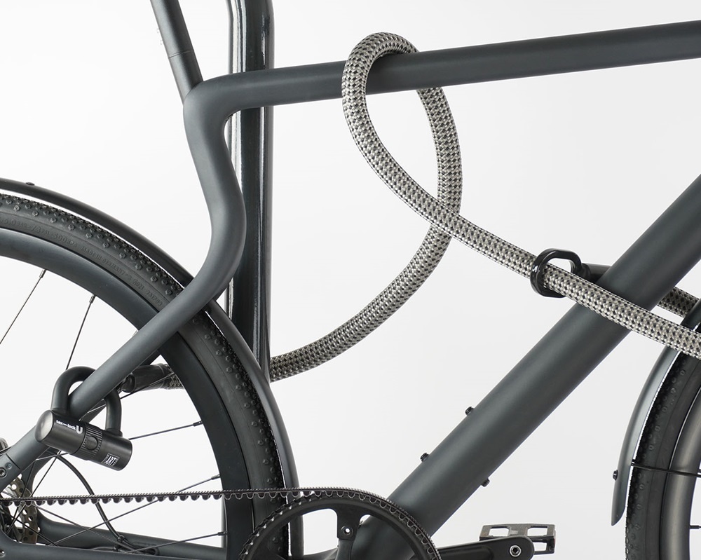 De unieke mate van flexibiliteit van de Tex-Lock biedt extra gemak bij het écht veilig op slot zetten van de fiets. U kunt uw fiets vastzetten aan een fietsenrek, lantaarnpaal, boom of een ander vaststaand object. Gebruik het doorlusprincipe om verschillende fietsonderdelen tegelijk vast te maken. Plaats de kabel rond twee onderdelen. Trek het kleine oog door het grotere oog aan het andere uiteinde. Gebruik vervolgens de kabel en het U-slot om andere waardevolle fietsonderdelen aan een vast object vast te maken.
