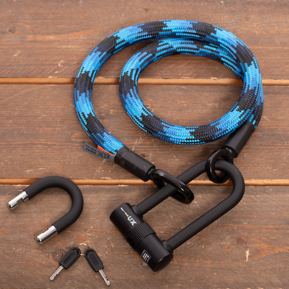 Het hier beschreven slot is een Eyelet M met een U/X-Lock. Dit houdt in dat het slot wordt geleverd met twee beugels van verschillende lengtes. De langere X-lock beugel (14 cm) bevestigt verschillende fietsonderdelen of je fiets aan vaste objecten. De kortere U-lock beugel (6 cm) zit juist dichter bij de fiets, waardoor deze moeilijker open te breken is. De sluitingen kunnen aan beide zijden worden vergrendeld.