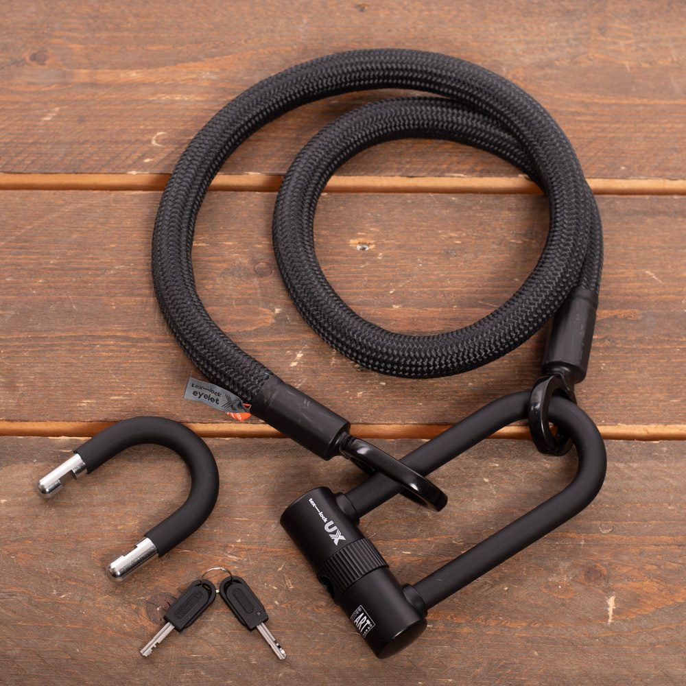 Het hier beschreven slot is een Eyelet M met een U/X-Lock. Dit houdt in dat het slot wordt geleverd met twee beugels van verschillende lengtes. De langere X-lock beugel (14 cm) bevestigt verschillende fietsonderdelen of je fiets aan vaste objecten. De kortere U-lock beugel (6 cm) zit juist dichter bij de fiets, waardoor deze moeilijker open te breken is. De sluitingen kunnen aan beide zijden worden vergrendeld.