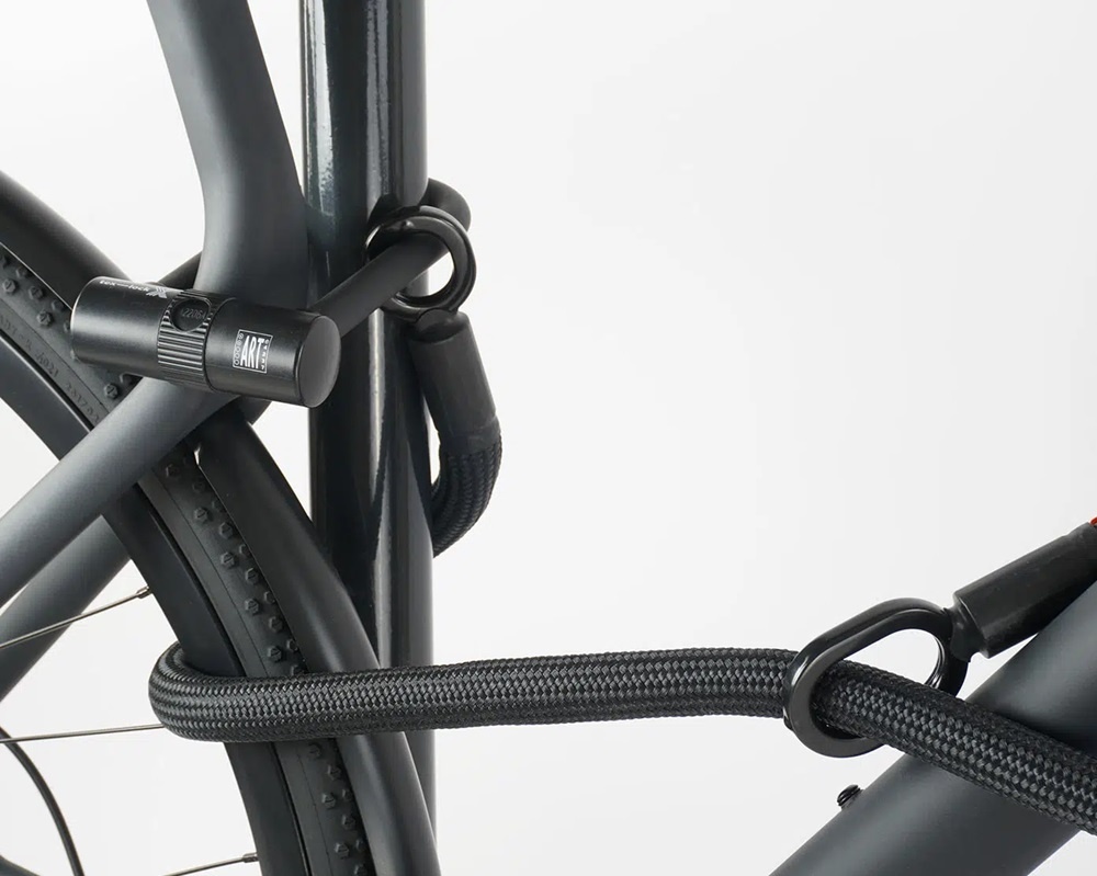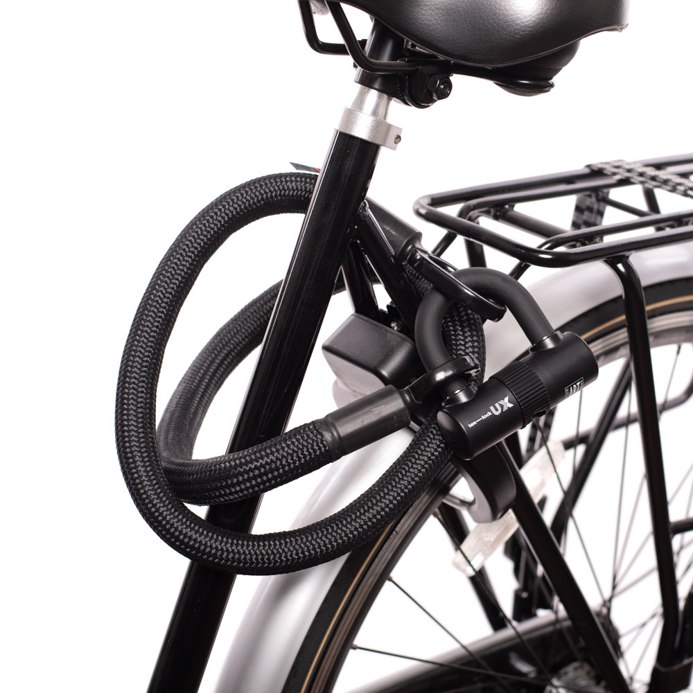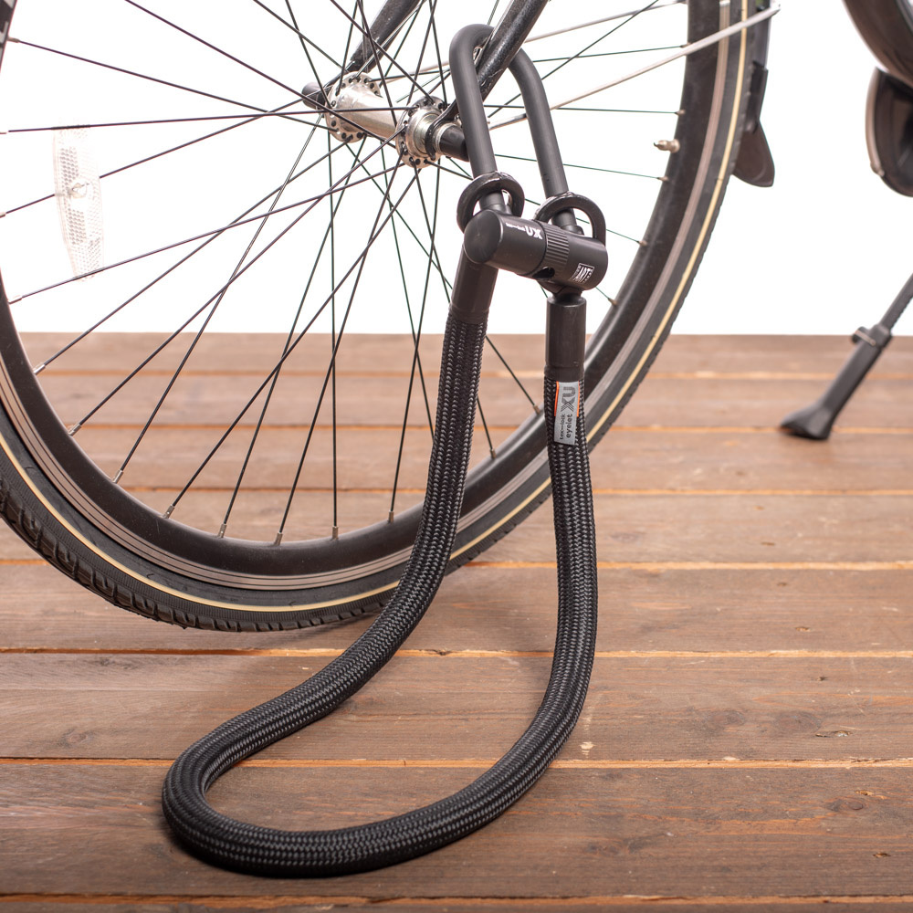 De unieke mate van flexibiliteit van de Tex-Lock biedt extra gemak bij het écht veilig op slot zetten van de fiets. U kunt uw fiets vastzetten aan een fietsenrek, lantaarnpaal, boom of een ander vaststaand object. Gebruik het doorlusprincipe om verschillende fietsonderdelen tegelijk vast te maken. Plaats de kabel rond twee onderdelen en trek het kleine oog door het grotere oog aan het andere uiteinde. Gebruik vervolgens de kabel en het U-slot om andere waardevolle fietsonderdelen aan een vast object vast te maken.
