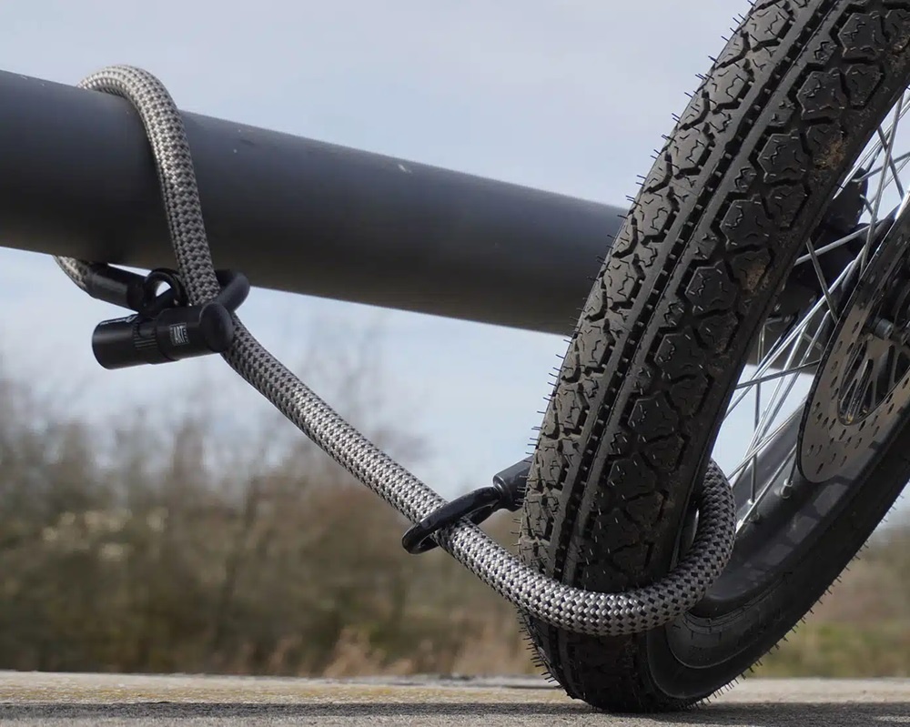 De unieke mate van flexibiliteit van de Tex-Lock biedt extra gemak bij het écht veilig op slot zetten van de fiets. U kunt uw fiets vastzetten aan een fietsenrek, lantaarnpaal, boom of een ander vaststaand object. Gebruik het doorlusprincipe om verschillende fietsonderdelen tegelijk vast te maken. Plaats de kabel rond twee onderdelen en trek het kleine oog door het grotere oog aan het andere uiteinde. Gebruik vervolgens de kabel en het U-slot om andere waardevolle fietsonderdelen aan een vast object vast te maken.