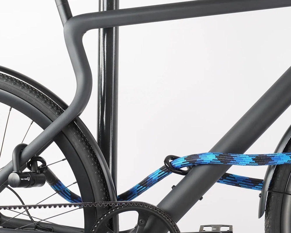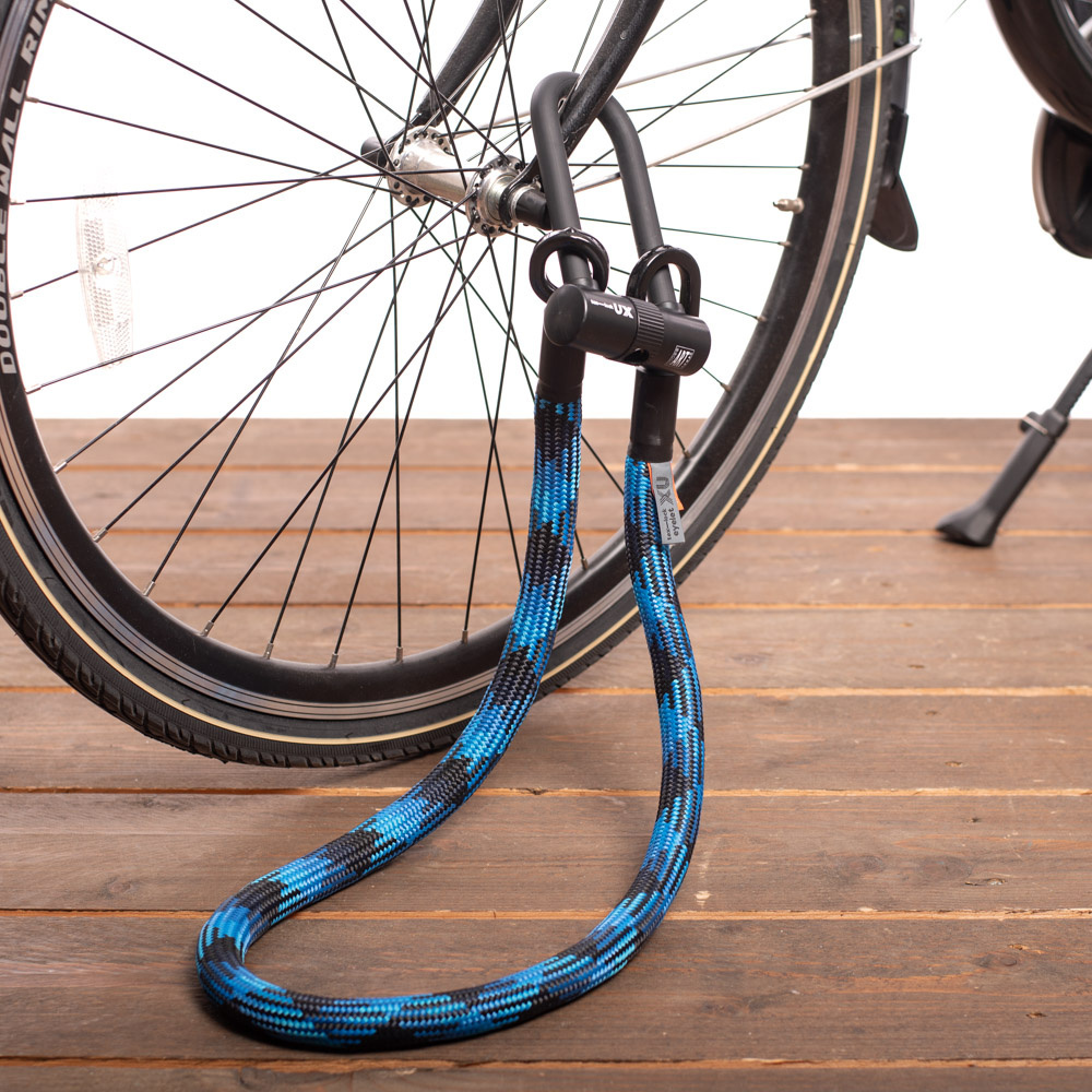 De unieke mate van flexibiliteit van de Tex-Lock biedt extra gemak bij het écht veilig op slot zetten van de fiets. U kunt uw fiets vastzetten aan een fietsenrek, lantaarnpaal, boom of een ander vaststaand object. Gebruik het doorlusprincipe om verschillende fietsonderdelen tegelijk vast te maken. Plaats de kabel rond twee onderdelen en trek het kleine oog door het grotere oog aan het andere uiteinde. Gebruik vervolgens de kabel en het U-slot om andere waardevolle fietsonderdelen aan een vast object vast te maken.