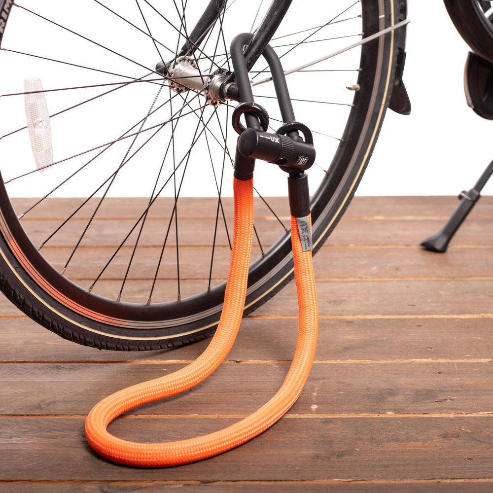 De unieke mate van flexibiliteit van de Tex-Lock biedt extra gemak bij het écht veilig op slot zetten van de fiets. U kunt uw fiets vastzetten aan een fietsenrek, lantaarnpaal, boom of een ander vaststaand object. Gebruik het doorlusprincipe om verschillende fietsonderdelen tegelijk vast te maken. Plaats de kabel rond twee onderdelen en trek het kleine oog door het grotere oog aan het andere uiteinde. Gebruik vervolgens de kabel en het U-slot om andere waardevolle fietsonderdelen aan een vast object vast te maken.