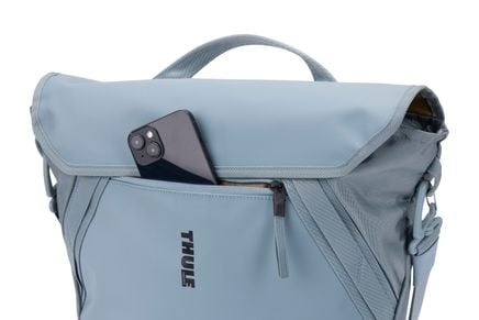 De lichtblauwe Chasm Courier van Thule is een enkele fietstas en stijlvolle messenger bag/koerierstas ineen, met een inhoud van 22 liter. De fietstas is geschikt voor bevestiging aan de bagagedrager met het Thule InLock-systeem. Het is een ideale 'stadse' tas voor woon-werkverkeer en dagelijks gebruik.