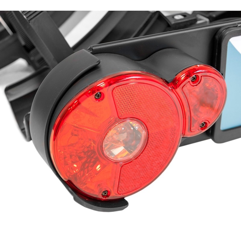 Zie ook de handleiding. Bij deze fietsdrager ontvangt u daarnaast een 13-polige stekker die u aansluit op de auto, bestemd voor de verlichting. Deze lampen zijn links en rechts gegoten in een zacht ronde vorm. De stekker werkt met de zogeheten bajonetaansluiting: met een kwartslag draait u deze stevig vast. En u kunt veilig op weg, voor een ontspannende tocht.