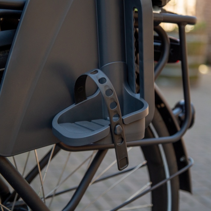 Dit achterstoeltje kan worden beveiligd dankzij het nieuwe geïntegreerde metalen slot met sleutel. Zo voorkomt u diefstal van het zitje wanneer de fiets buiten staat. Daarnaast is een beveiligingsriem toegevoegd om het zitje nog extra te bevestigen aan het frame.