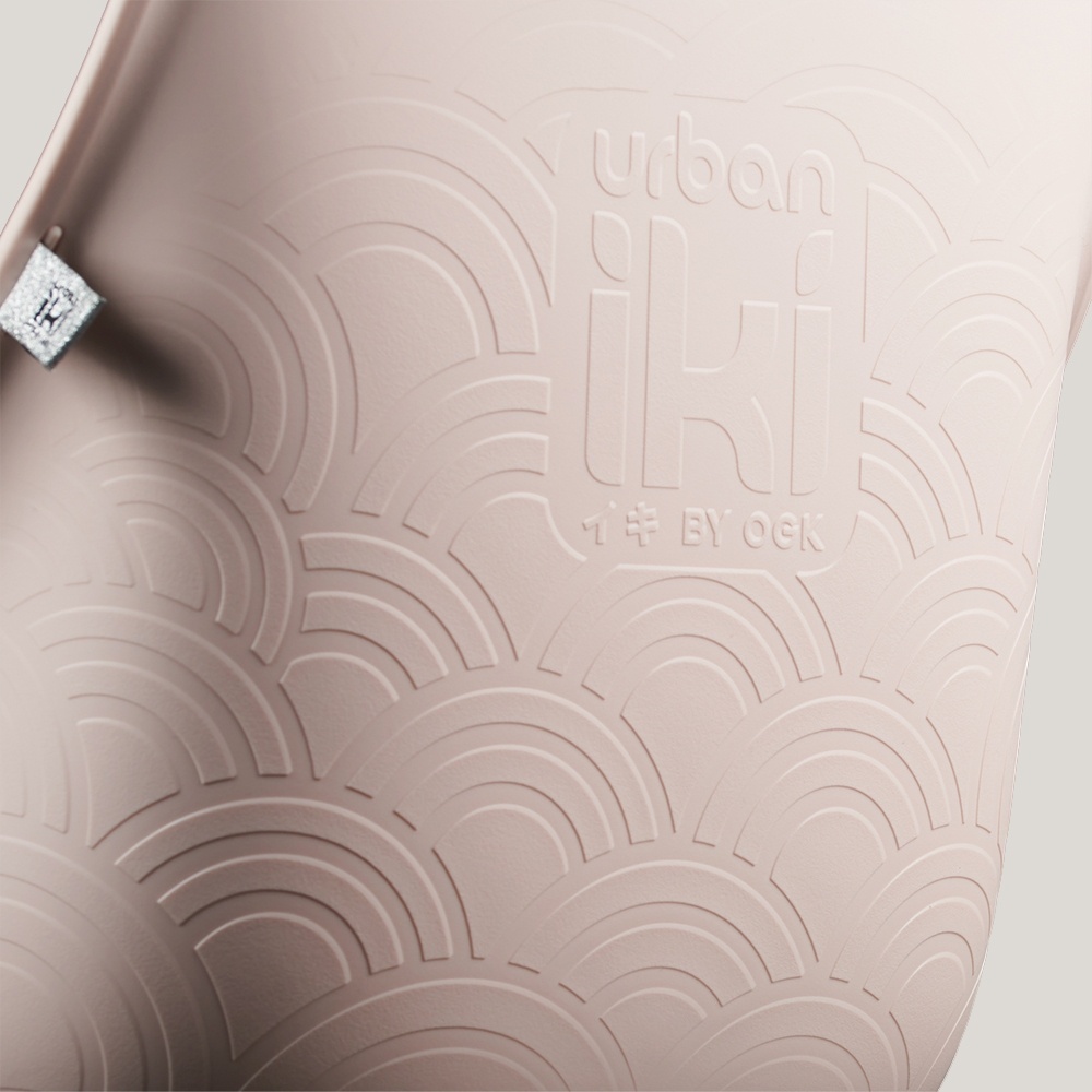 Het Iki-gevoel komt onder meer tot uiting in het rustige, trendy Dutch Design. Dit stoeltje is ook opvallend compact, met aandacht voor stijl. Het Urban Iki-achterzitje heeft een ronde, elegante belijning. Als speciaal tintje is er aan de buitenzijde de gravure van een Japans golfpatroon, dat symbool staat voor 'pieken van geluk'. Zelfs de veiligheidsgordel is er in een speciaal geweven patroon: niet gewoon standaard zwart, maar met een mix van grijstinten.