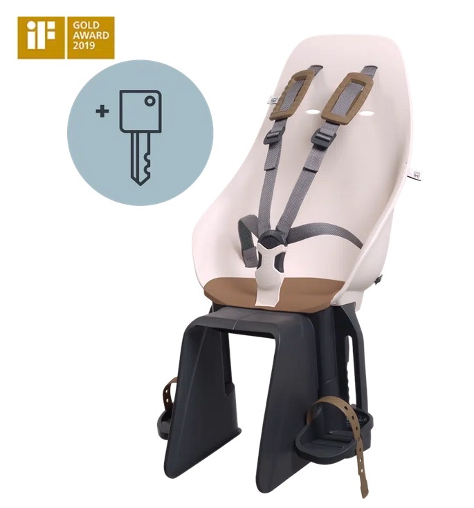 Dit achterstoeltje kan worden beveiligd dankzij het nieuwe geïntegreerde metalen slot met sleutel. Zo voorkomt u diefstal van het zitje wanneer de fiets buiten staat. Daarnaast is een beveiligingsriem toegevoegd om het zitje nog extra te bevestigen aan het frame.
