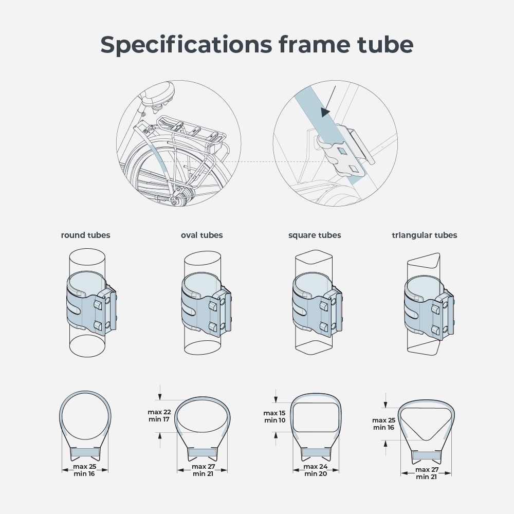 Het zitje is gemakkelijk te bevestigen met het meegeleverde bevestigingsmateriaal en past ook op e-bikes. Het zitje is geschikt voor bagagedragers met een breedte van 120 tot 175 mm. En voor de voetsteunen is een framebuis met een diameter van 16-25 mm nodig. Dankzij het handige Click & Go-systeem is het zitje gemakkelijk van de drager te halen wanneer u zonder passagier fietst.