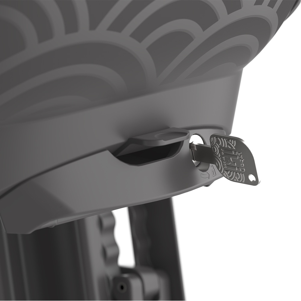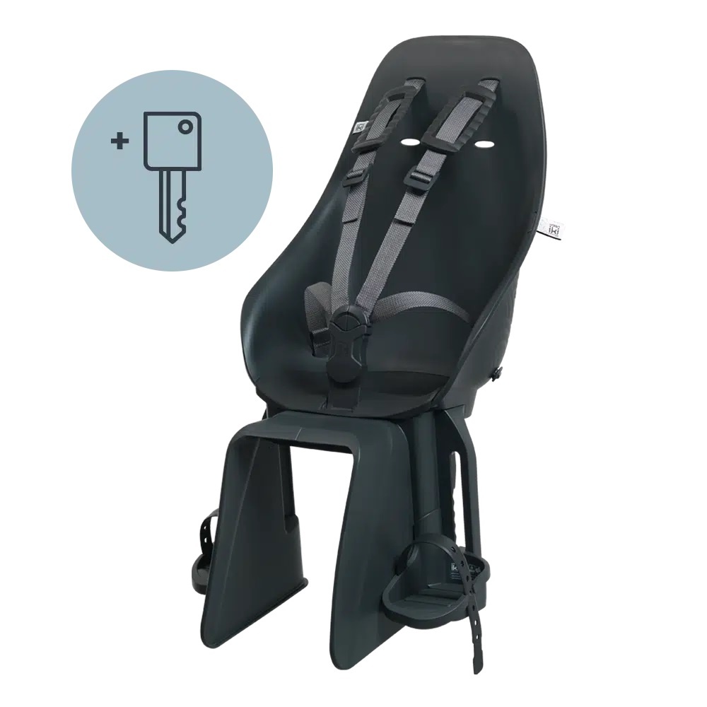Dit achterstoeltje kan worden beveiligd dankzij het nieuwe geïntegreerde metalen slot met sleutel. Zo voorkomt u diefstal van het zitje wanneer de fiets buiten staat. Daarnaast is een beveiligingsriem toegevoegd om het zitje nog extra te bevestigen aan het frame.