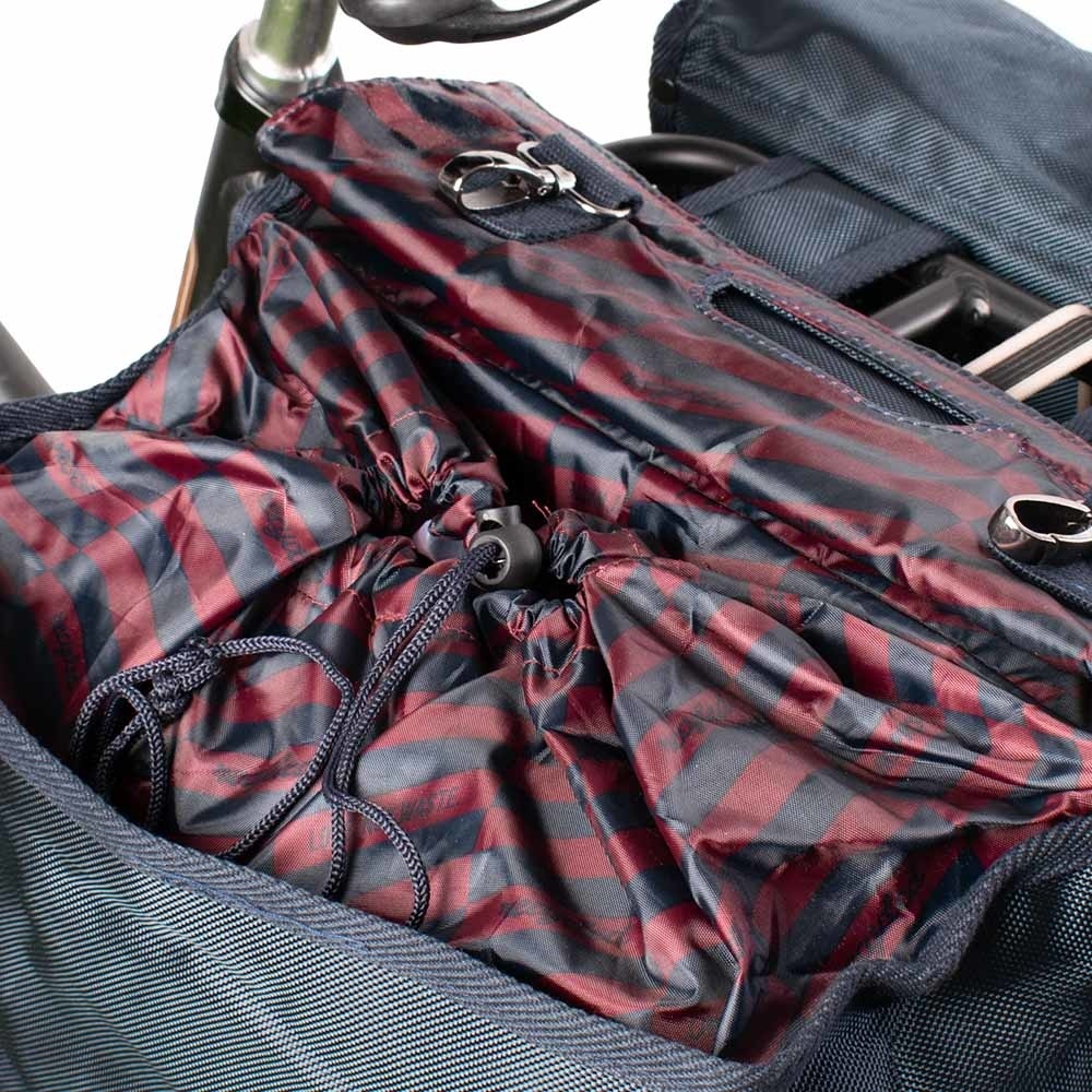 Het materiaal van de fietstas is waterafstotend en UV-bestendig, zodat de tas niet verkleurt in de zon. Ook de gestreepte binnenvoering - met aansnoerkoord - is waterbestendig. Voor een goede zichtbaarheid in het verkeer zijn de zijkanten voorzien van een reflecterende streep.