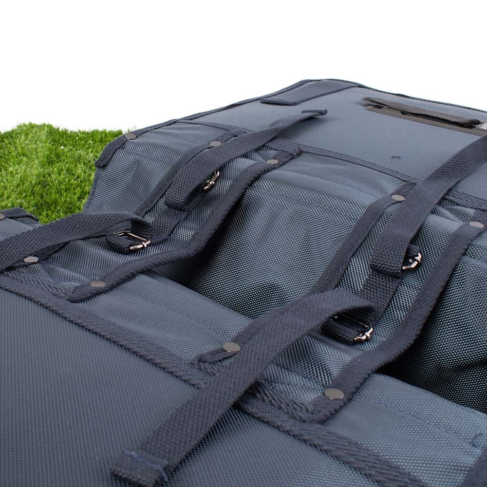 De dubbele tas heeft twee grote opbergvakken met een totale inhoud van 40 liter. De bodem en de achterkant van de tas zijn verstevigd, zodat u er ook zwaardere spullen zoals boodschappen mee kunt vervoeren. De tas sluit met chromen haken.
