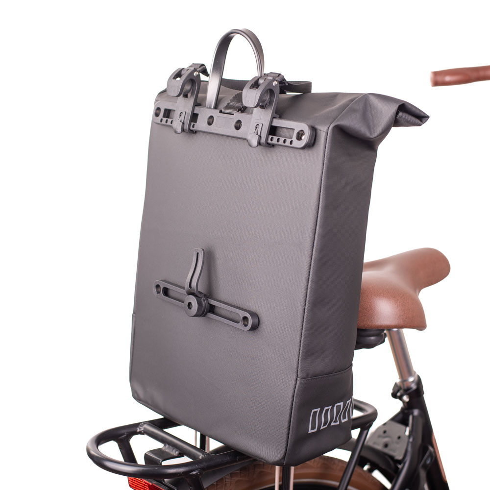 De tas is eenvoudig aan de bagagedrager te bevestigen met de twee haken achterop de tas. Deze haken zijn verstelbaar in de breedte. Even trekken aan het handvat dat gekoppeld is aan het bevestigingssysteem en beide haken klikken soepel los van de bagagedragerbuis. Voor extra stabiliteit is er ook een draaibare haak onderaan de tas. De tas is ook geschikt voor e-bikes.