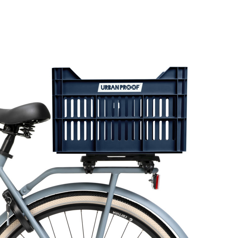 Deze duurzame donkerblauwe fietskrat van het Amsterdamse merk Urban Proof is gemaakt van gerecycled plastic en geproduceerd in Europa voor een kleinere ecologische voetafdruk. De vernieuwde, gemoderniseerde fietskrat heeft op de voorkant een nieuw logo met reflectie en een uitsparing om een fietslampje te plaatsen. De fietskrat is geschikt voor elke fiets en e-bike met een bagagedrager.