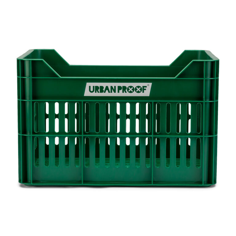 Deze duurzame donkergroene fietskrat van het Amsterdamse merk Urban Proof is gemaakt van gerecycled plastic en geproduceerd in Europa voor een kleinere ecologische voetafdruk. De vernieuwde, gemoderniseerde fietskrat heeft op de voorkant een nieuw logo met reflectie en een uitsparing om een fietslampje te plaatsen. De fietskrat is geschikt voor elke fiets en e-bike met een bagagedrager.