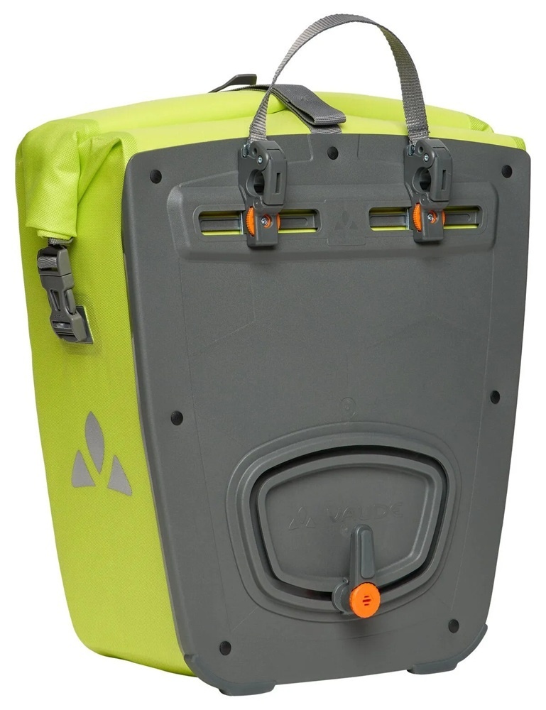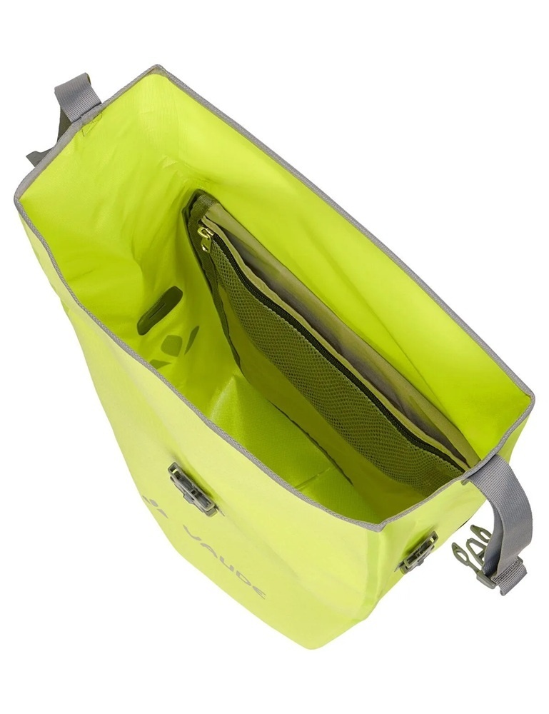 Een waterdichte enkele fietstas voor achterop de fiets, van Vaude, uitgevoerd in fluorescerend geel/groen met grijze details. De kwaliteitstas is door de waterdichte rolsluiting in hoogte verstelbaar. De Aqua Back Single heeft een inhoud van 24 liter en is met de afneembare en verstelbare grijze schouderband ook als schoudertas te gebruiken.