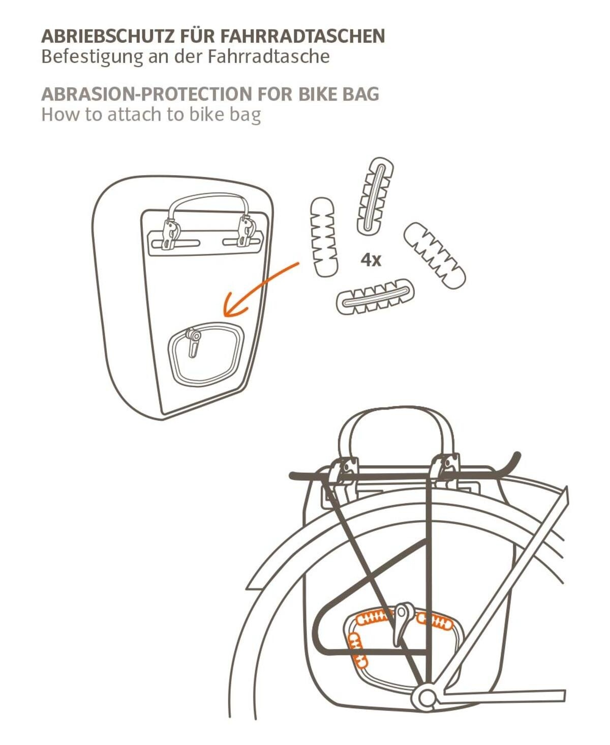 Een set bagagedragerbeschermers voor fietstassen van het merk Vaude, om krassen op de bagagedrager te voorkomen. De (optionele) beschermers zijn eenvoudig te monteren, en beschermen de drager tegen beschadigingen en slijtage bij het rijden met bagagedragertassen.