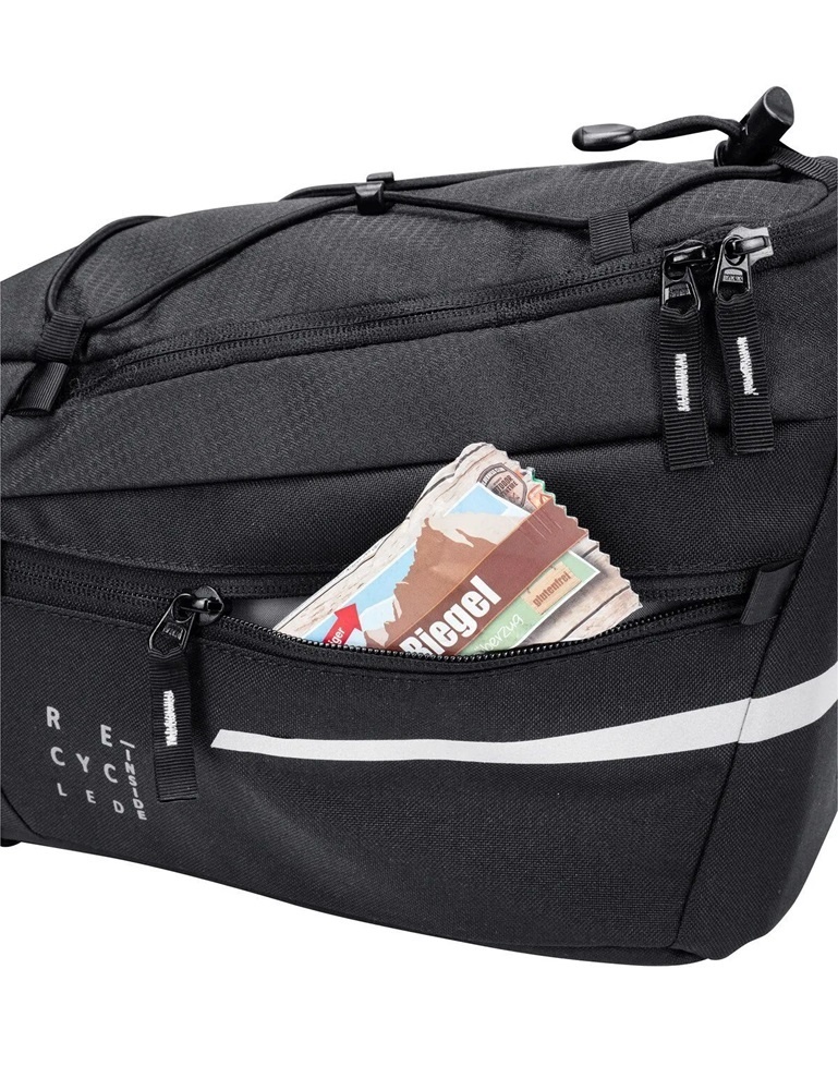 Het hoofdvak van de Silkroad M is uitgerust met een sleutelclip en een ritsvak van gaas in de klep. Het hoofdvak sluit met een ritssluiting rondom, zodat de klep opengeklapt kan worden en u overal gemakkelijk bij kunt. Op de beide zijkanten van de tas zit een ritsvak, en onder het elastieken bagagenet bovenop de tas kunt u bijvoorbeeld een regenjack kwijt. De tas is voorzien van een opvallende reflecterende streep, en een lus waaraan een lichtje kan worden bevestigd. Een oranje regenhoes is ook inbegrepen. En met de bijgeleverde zwarte schouderband kunt u de fietstas ook als schoudertas dragen.