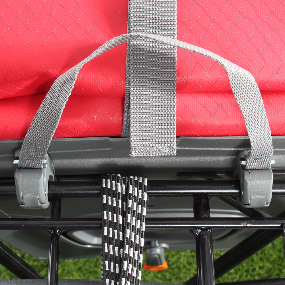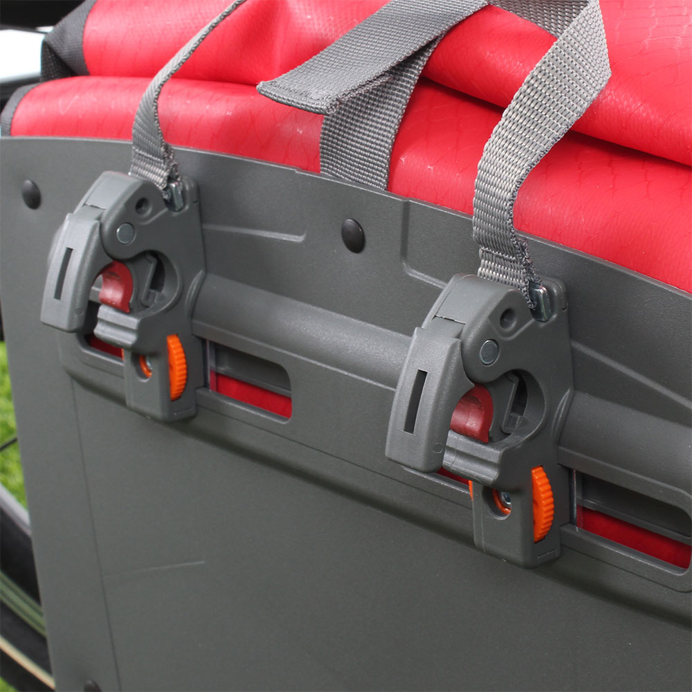 De unieke functie van Vaude die ervoor zorgt dat het afnemen van de tas letterlijk in één beweging gebeurt, heet Quick Mount Release (QMR). Even trekken aan het handvatkoord dat gekoppeld is aan het kliksysteem, en de beide haken klikken soepel los van de bagagedragerbuis. Deze haken zijn in de breedte te verschuiven via twee railtjes in combinatie met makkelijk te bedienen handwieltjes. De haken passen standaard op dragerbuizen van 16 millimeter. U ontvangt echter adaptertjes om de tas ook geschikt te maken voor buizen van 8,5, 10,5 en/of 13 mm. Het geheel bevindt zich aan de beide zijden op een harde achterplaat. Daarop zit iets lager nóg een zeer flexibel te verstellen haak, voor aanvullende stabiliteit aan de fiets.