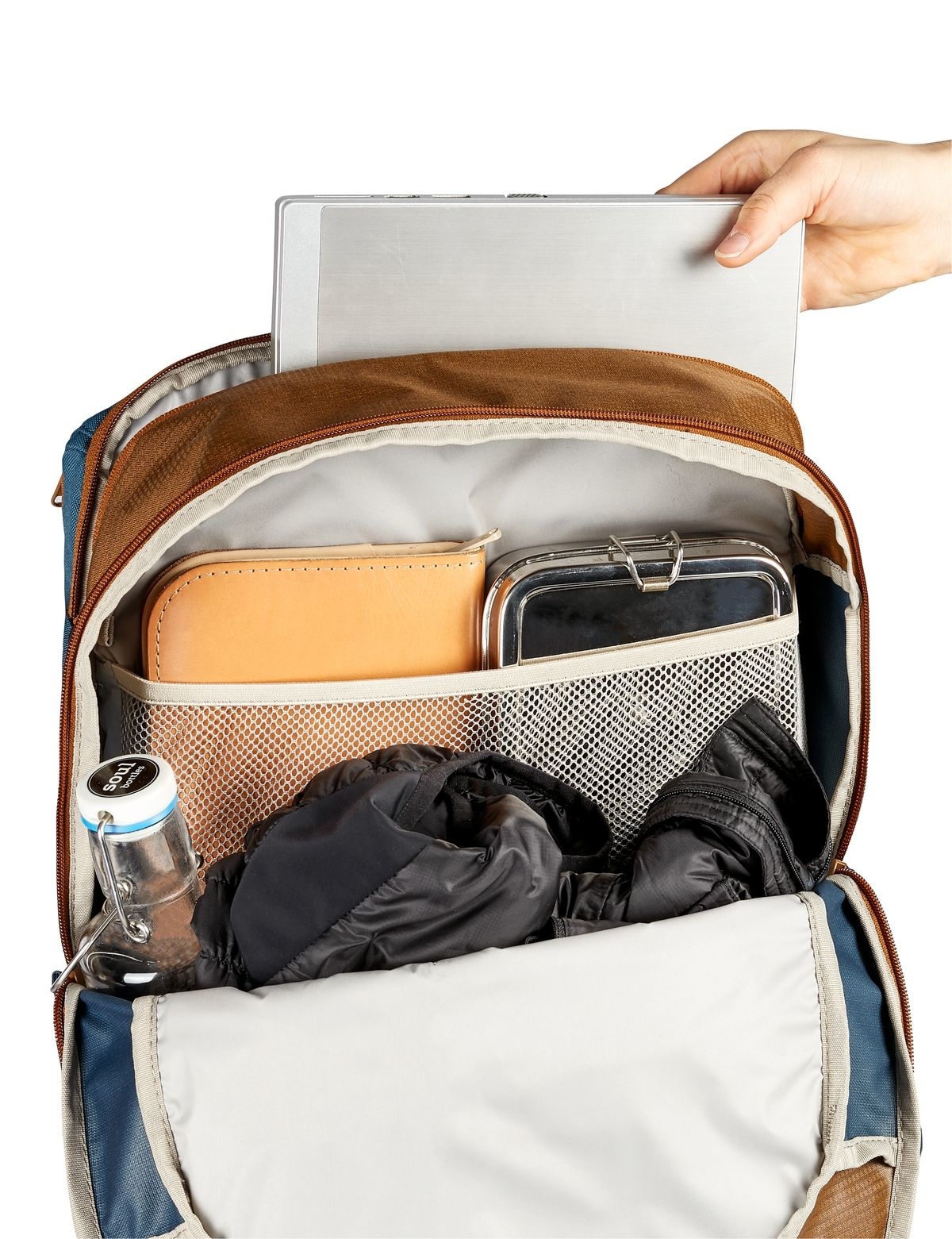 De tas heeft een ruim hoofdvak geschikt voor documenten op A4-formaat, met achterin een steekvak. Daarvoor zit een iets kleiner vak met ritssluiting, met daarin een handige organiser met veel verschillende vakjes, voor het overzichtelijk opbergen van kleinere spullen (telefoon, sleutels, etc.). Achter het hoofdvak is een apart, gevoerd vak aanwezig voor een laptop van maximaal 15,6 inch. En op de voorkant van de tas zit nog een klein ritsvak en een elastisch opbergvak van mesh. Ook is er gedacht aan reflecterende elementen en een speciale houder waar u ledlampjes aan kunt bevestigen.