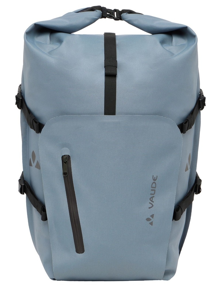 De enkele fietstas Free Cargo van het bekende merk Vaude is waterdicht en heeft een inhoud van ca. 23 liter. De blauwgrijze tas is vrijwel volledig gemaakt van gerecyclede materialen en voorzien van een rolsluiting, een schouderband, compressiebanden, reflecterende elementen en het QMR 2.0 bevestigingssysteem. Handig is dat er achter het voorvak ruimte is voor het meenemen van extra bagage.