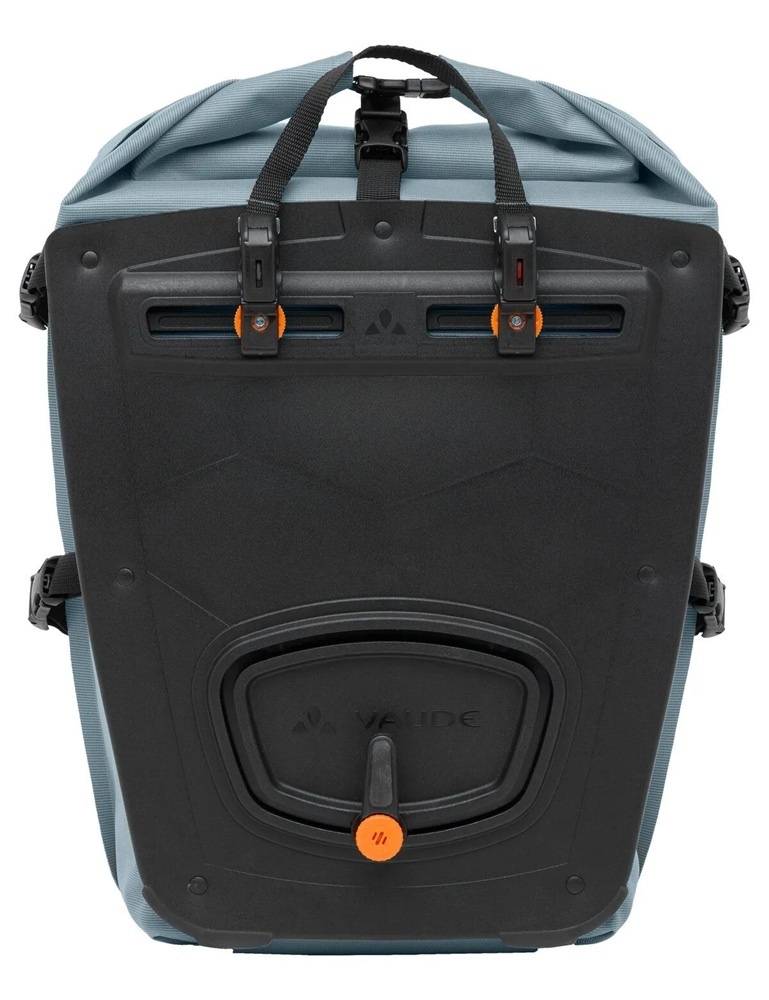 Het gebruiksvriendelijke bevestigingssysteem van Vaude heet Quick Mount Release (QMR 2.0). Even trekken aan het handvatkoord dat gekoppeld is aan het kliksysteem, en de beide haken klikken soepel los van de bagagedragerbuis. Deze haken zijn in de breedte te verschuiven via twee railtjes in combinatie met makkelijk te bedienen handwieltjes. De haken passen standaard op dragerbuizen van 16 millimeter. U ontvangt bovendien adaptertjes om de tas ook geschikt te maken voor buizen van 8,5, en 13 mm. Wat lager op de hardback 2.0 Eco-achterplaat van de tas zit nog een flexibele, draaibare haak, voor aanvullende stabiliteit aan de fiets. De achterplaat is gemaakt van gerecyclede plastic onderdelen van afgedankte auto's.