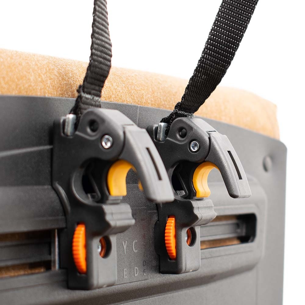 Met het Quick Mount Release (QMR)-systeem van Vaude kun u de tas in één beweging van de fiets afnemen. Even trekken aan het handvatkoord dat gekoppeld is aan het kliksysteem, en de haken klikken soepel los van de bagagedragerbuis. De haken zijn in de breedte te verschuiven via twee railtjes in combinatie met makkelijk te bedienen handwieltjes. De haken passen standaard op dragerbuizen van 16 millimeter. Inbegrepen zijn adaptertjes om de tas ook geschikt te maken voor buizen van 8,5 mm en 13 mm. Iets lager op de achterplaat zit nog een flexibel te verstellen haak, voor aanvullende stabiliteit aan de fiets. Vaude adviseert bij de montage een minimale afstand van 11 cm aan te houden tussen de haken.