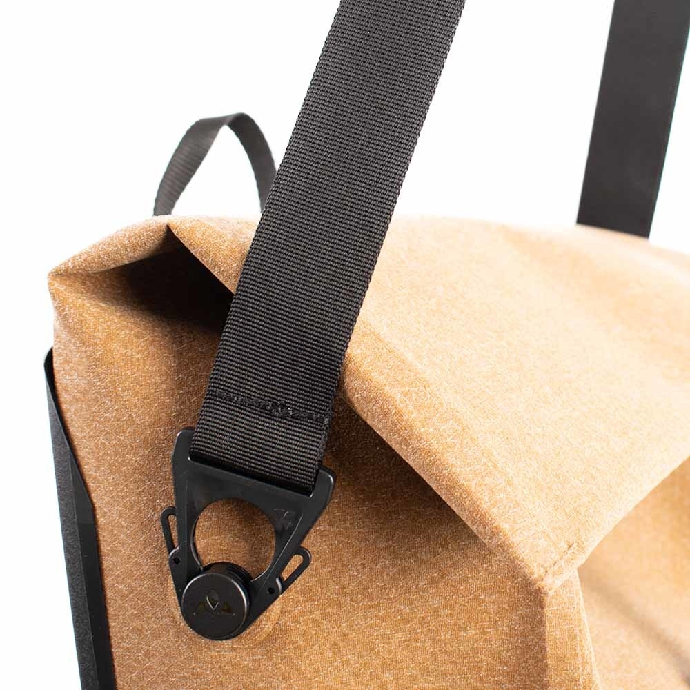 De tas heeft een hardshell achterplaat met anti-slip voetjes aan de onderkant. Van de fiets af, kunt u de tas dragen aan de afneembare schouderband. De schouderriem heeft een slimme bevestiging met een klikgesp en een knop aan de zijkant. De ingebouwde draaivergrendeling voorkomt dat de tas gaat kantelen tijdens het dragen. Voor een goede zichtbaarheid in het donker en bij slecht weer is op beide zijden van de tas reflectie aangebracht.