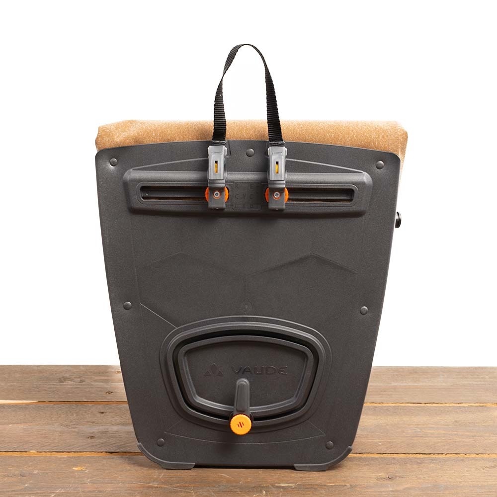 Met het Quick Mount Release (QMR)-systeem van Vaude kun u de tas in één beweging van de fiets afnemen. Even trekken aan het handvatkoord dat gekoppeld is aan het kliksysteem, en de haken klikken soepel los van de bagagedragerbuis. De haken zijn in de breedte te verschuiven via twee railtjes in combinatie met makkelijk te bedienen handwieltjes. De haken passen standaard op dragerbuizen van 16 millimeter. Inbegrepen zijn adaptertjes om de tas ook geschikt te maken voor buizen van 8,5 mm en 13 mm. Iets lager op de achterplaat zit nog een flexibel te verstellen haak, voor aanvullende stabiliteit aan de fiets. Vaude adviseert bij de montage een minimale afstand van 11 cm aan te houden tussen de haken.