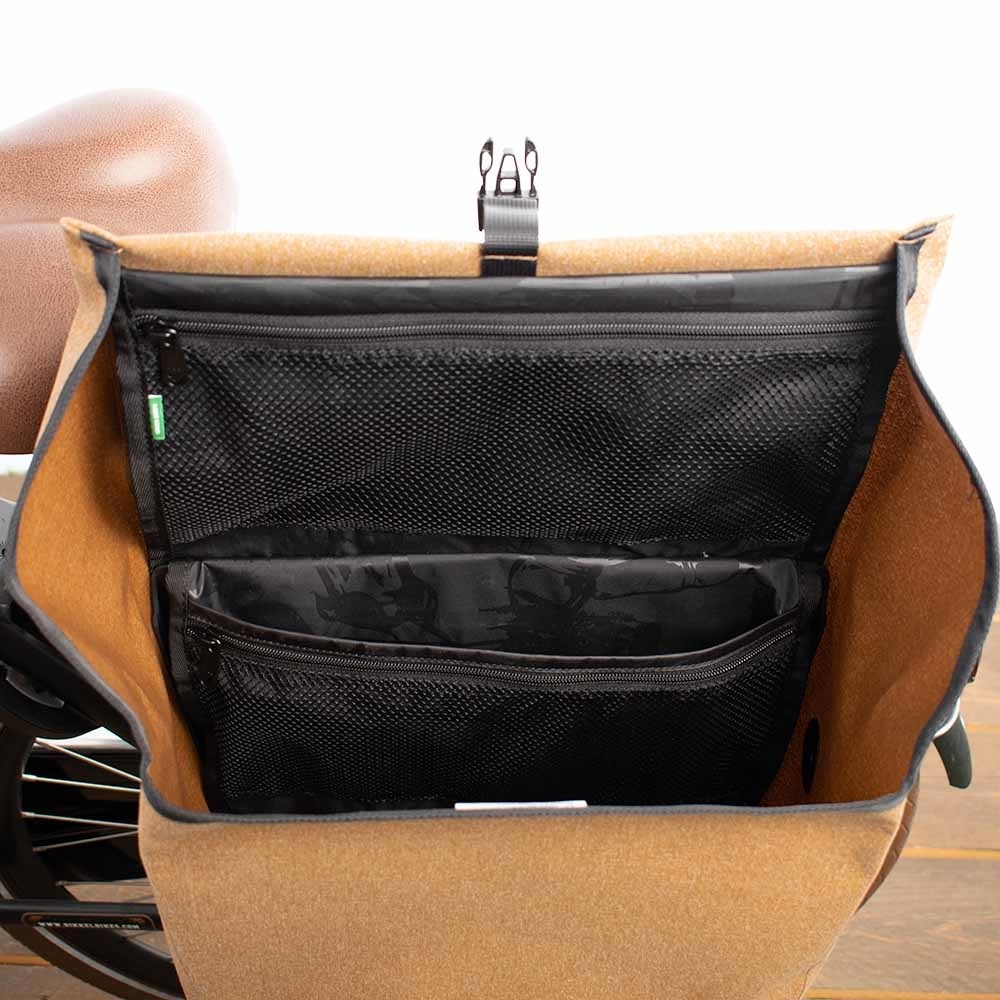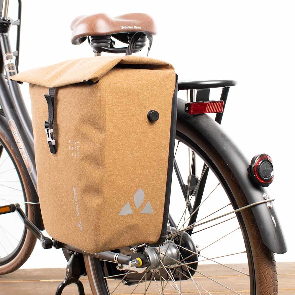 De bruine fietstas Recycle Pro Single van Vaude is een enkele fietstas van hoge kwaliteit, met een inhoud van ca. 20 liter. Met de afneembare en verstelbare schouderband is de tas ook als schoudertas te dragen. De naam zegt het al: de tas is vrijwel volledig gemaakt van gerecyclede materialen. Niet alleen stijlvol en praktisch dus, maar ook milieubewust en duurzaam!