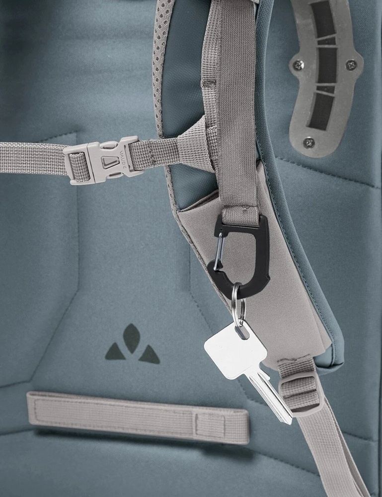 Aangekomen op uw bestemming? Dan kunt u de Plug and Ride-rail verwijderen en opbergen. U draagt de rugtas comfortabel dankzij de verstelbare, gevoerde schouderbanden met borstriem. Aan een van de schouderbanden is een praktisch elastiek met een sleutelclip bevestigd.