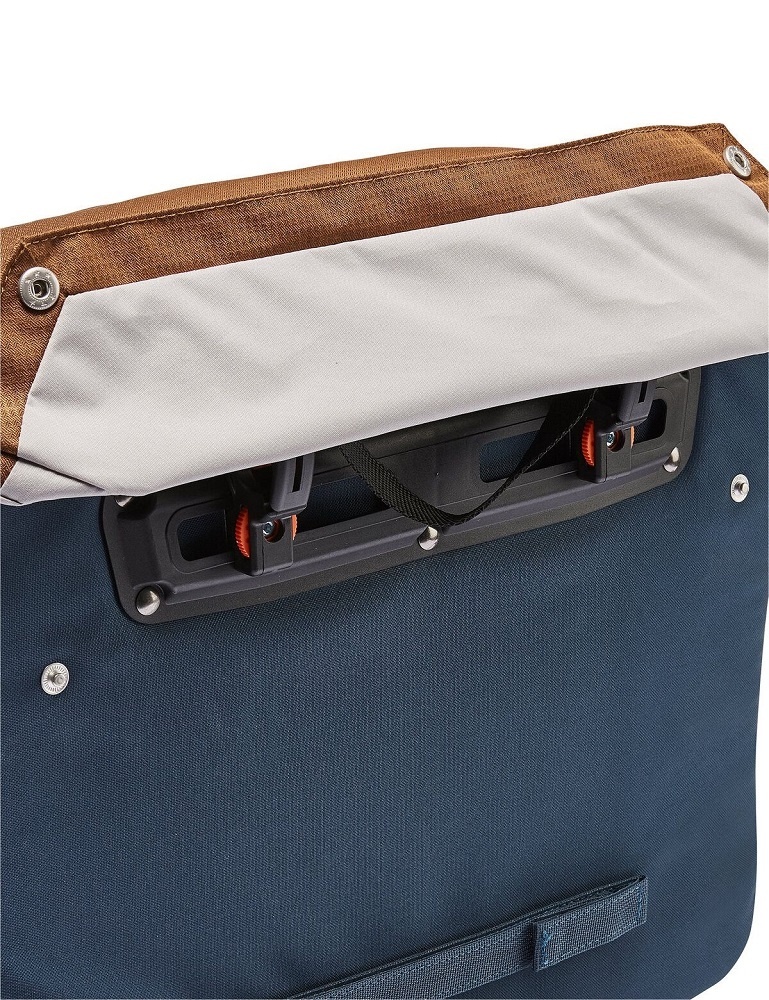 U bevestigt de tas eenvoudig met het Quick Mount Release-systeem (QMR 2.0) aan de drager van uw fiets. Wanneer u aan het handvatkoord trekt dat gekoppeld is aan het kliksysteem, klikken de haken los van de bagagedragerbuis. Deze haken zijn in de breedte te verschuiven via twee railtjes in combinatie met handwieltjes. De haken passen standaard op dragerbuizen van 16 millimeter en u ontvangt adaptertjes om de tas ook geschikt te maken voor buizen van 8,5 en/of 13 mm. De bevestigingsrail kan worden afgedekt met een flap met drukknopen, wanneer u de tas als schoudertas gebruikt. Onderaan de achterzijde zit klittenbandbevestiging om ervoor te zorgen dat de tas stabiel aan de fiets blijft zitten.