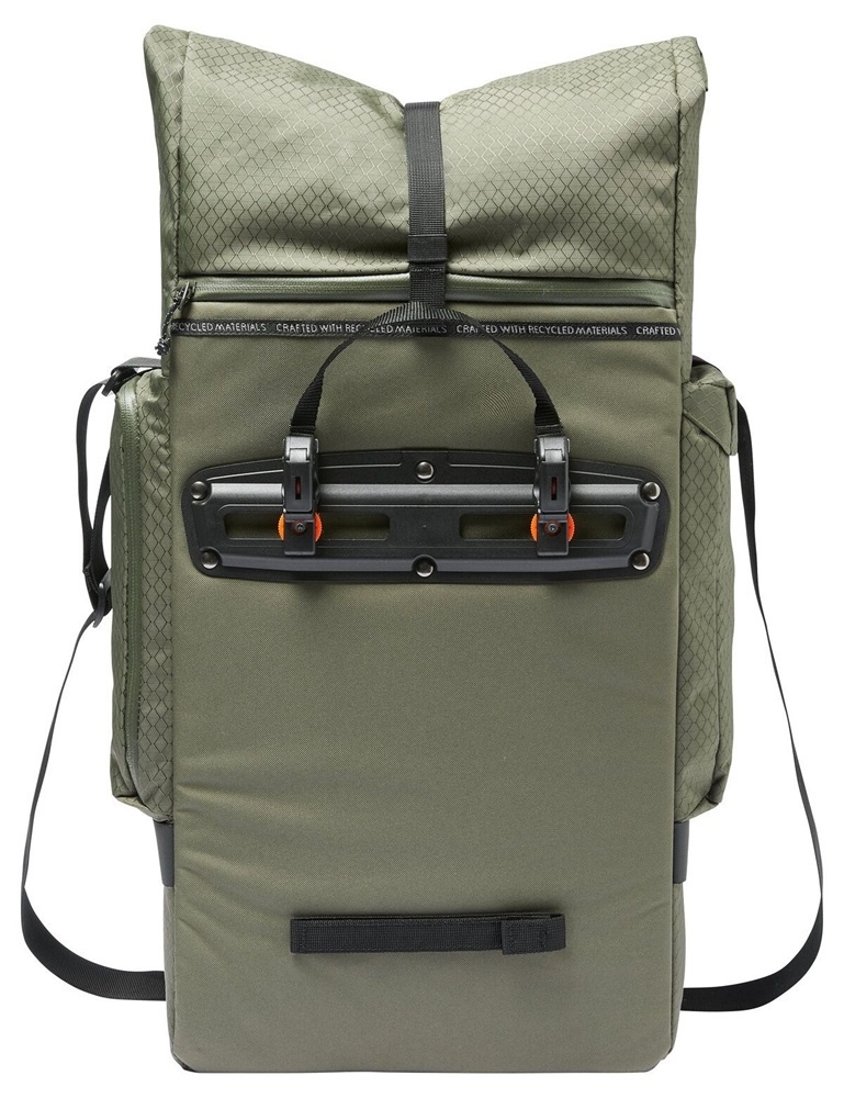Met het gebruiksvriendelijke Quick Mount Release 2.0 (QMR)-systeem van Vaude is de fietstas in één beweging van de fiets af te pakken. Even trekken aan het handvatkoord dat gekoppeld is aan het kliksysteem en de beide haken klikken soepel los van de bagagedragerbuis. Deze haken zijn in de breedte te verschuiven via twee railtjes in combinatie met makkelijk te bedienen handwieltjes. De haken passen standaard op ronde dragerbuizen tot 16 millimeter. U ontvangt ook adaptertjes om de tas geschikt te maken voor buizen van 8,5 en 13 mm. Onderaan de achterkant zit een strook klittenband, voor een extra stevige bevestiging aan de fiets. Van de fiets af draagt u de tas gemakkelijk met u mee aan de afneembare, verstelbare schouderriem.