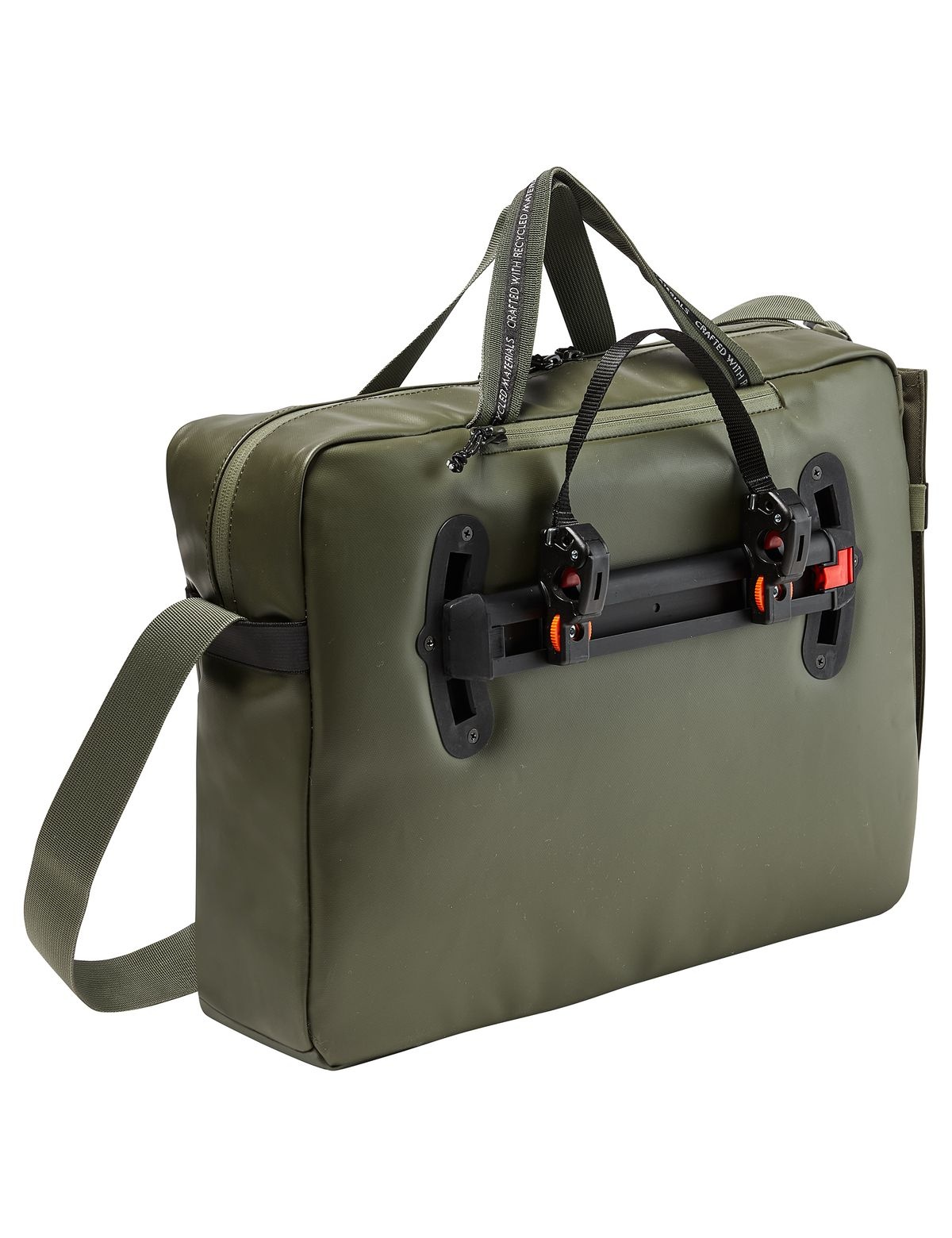 Van de fiets afgestapt en te voet verder naar kantoor? Dan draagt u deze fietstas voor naar het werk aan de schouderband met comfortabele schouderpolstering of aan de handvatten bovenaan de tas.