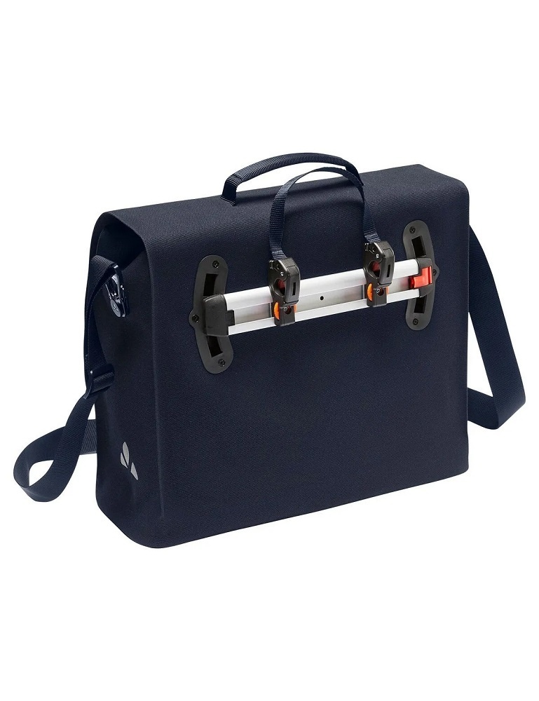 Van de fiets afgestapt en te voet verder naar kantoor? Dan draagt u deze fietstas voor naar het werk comfortabel met de goed gepolsterde schouderband. Deze schouderriem is afneembaar. Met de 2-in1 schouderriem/handgreep draagt u de tas eveneens prettig rechtstreeks aan dit handvat. De schouderband wordt op innovatieve wijze aan de tas vastgemaakt met een gesp. Als de band niet wordt gebruikt, is op de tas links en rechts slechts een knop zichtbaar die fraai in het ontwerp opgaat. Het systeem heeft bovendien een ingebouwde draaivergrendeling, zodat de tas tijdens het dragen niet gaat kantelen.