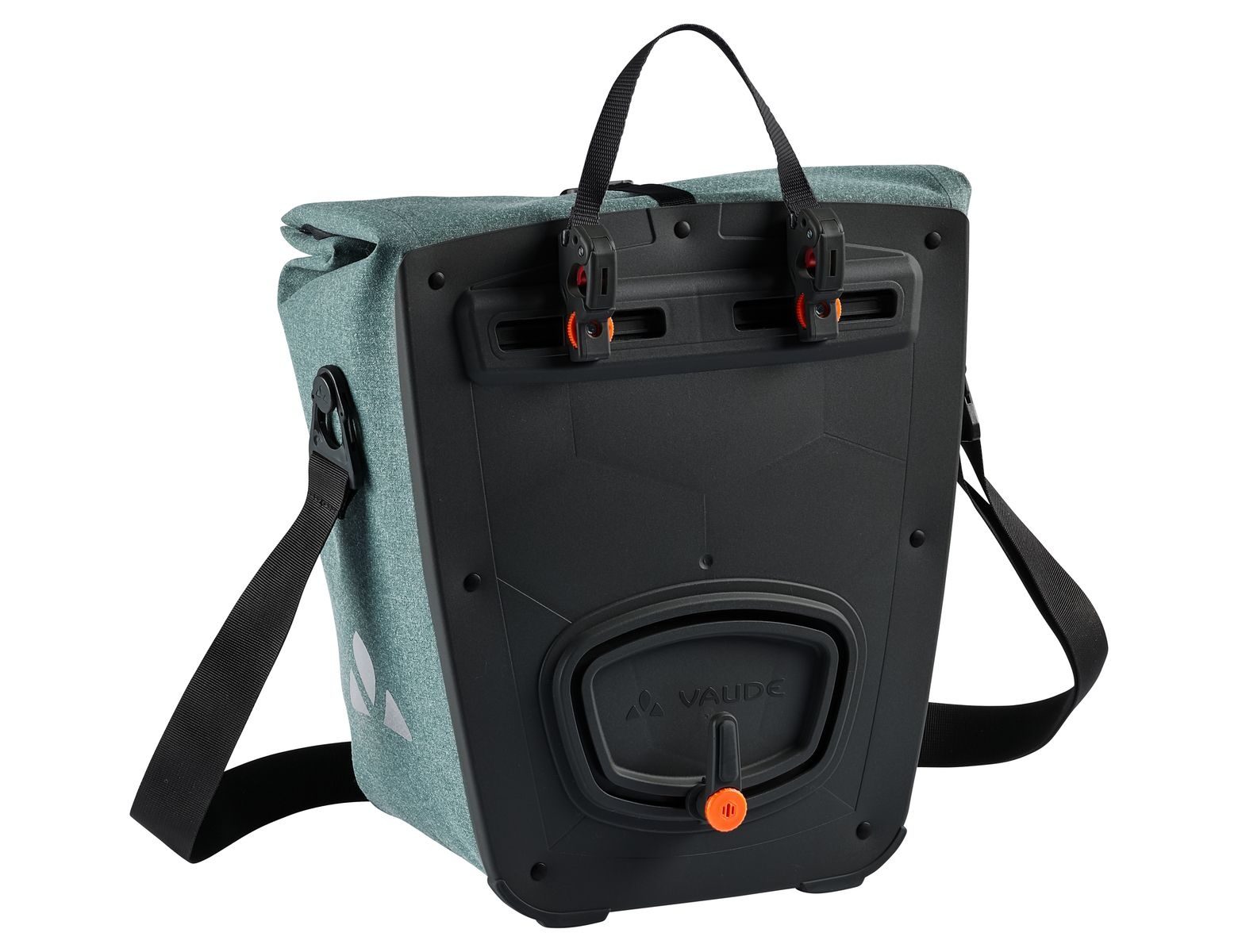 Met het Quick Mount Release (QMR)-systeem van Vaude kun u de tas in één beweging van de fiets afnemen. Even trekken aan het handvatkoord dat gekoppeld is aan het kliksysteem, en de haken klikken soepel los van de bagagedragerbuis. De haken zijn in de breedte te verschuiven via twee railtjes in combinatie met makkelijk te bedienen handwieltjes. De haken passen standaard op dragerbuizen van 16 millimeter. Inbegrepen zijn adaptertjes om de tas ook geschikt te maken voor buizen van 8,5 mm en 13 mm. Iets lager op de achterplaat zit nog een flexibel te verstellen haak, voor aanvullende stabiliteit aan de fiets. Vaude adviseert bij de montage een minimale afstand van 11 cm aan te houden tussen de haken. De tas kan zowel links als rechts aan de drager worden geplaatst.